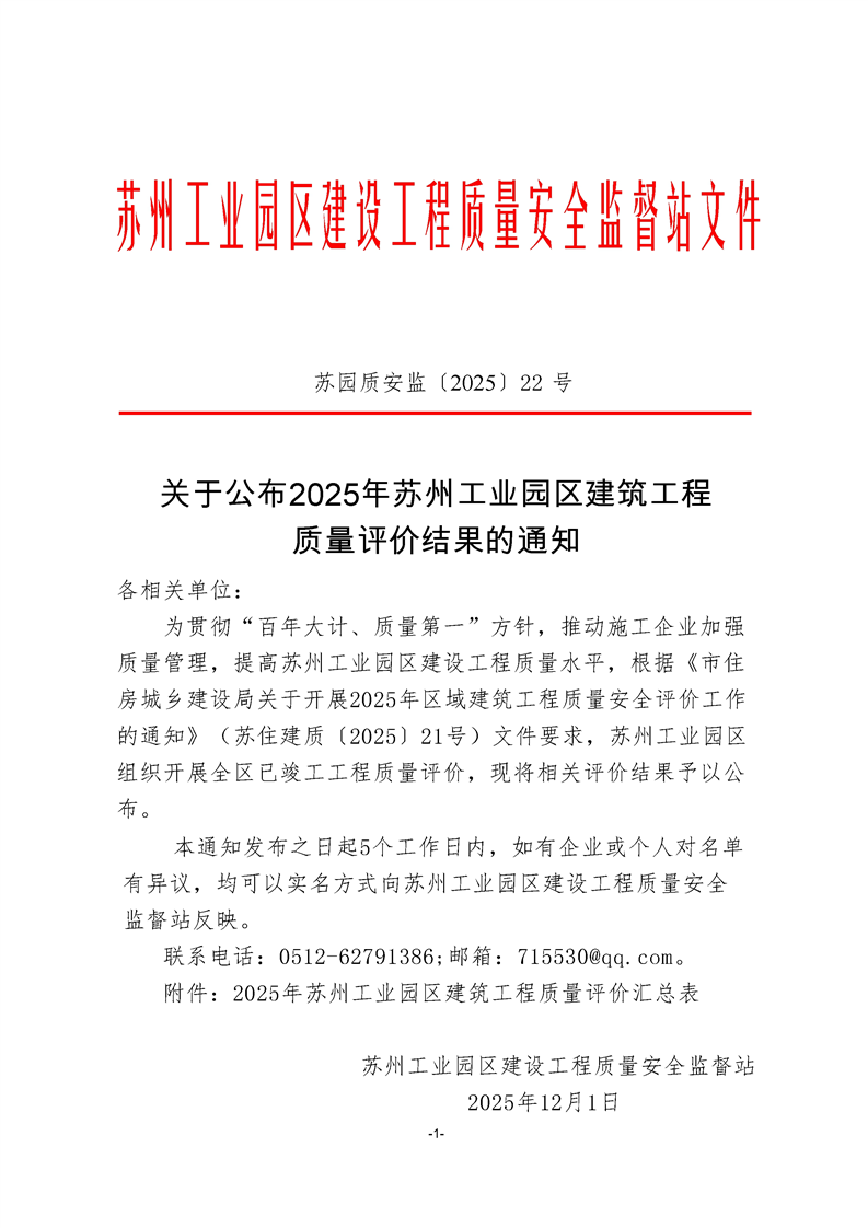 關(guān)于公布2025年蘇州工業(yè)園區(qū)建筑工程質(zhì)量評價結(jié)果的通知