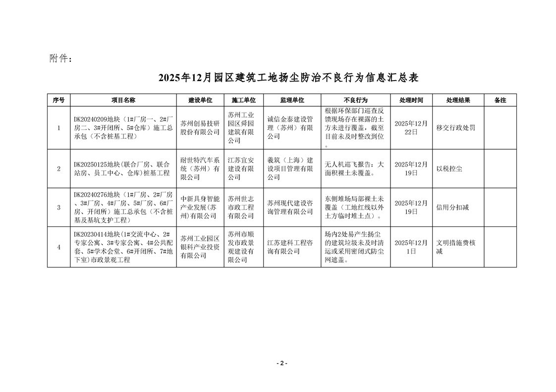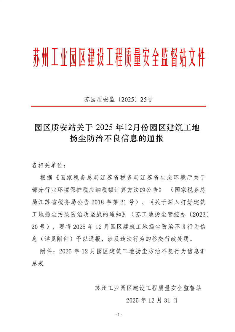 園區質安站關于2025年12月份園區建筑工地揚塵防治不良信息的通報