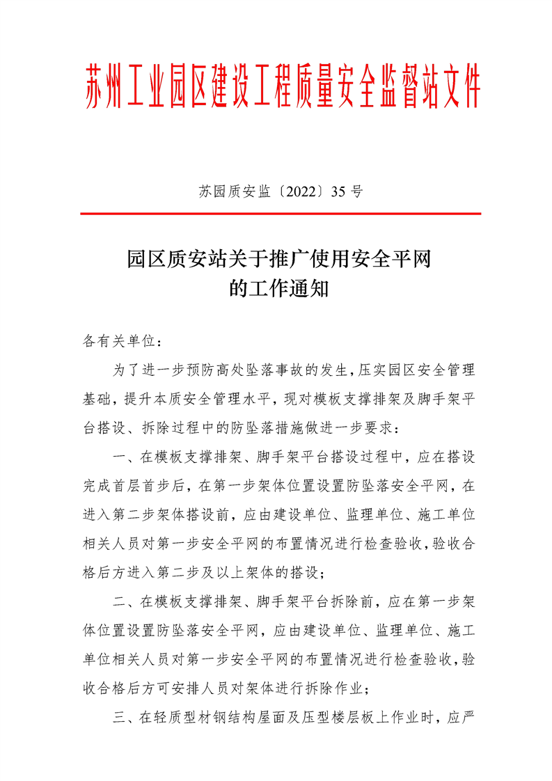 園區(qū)質(zhì)安站關于推廣使用安全平網(wǎng)的工作通知