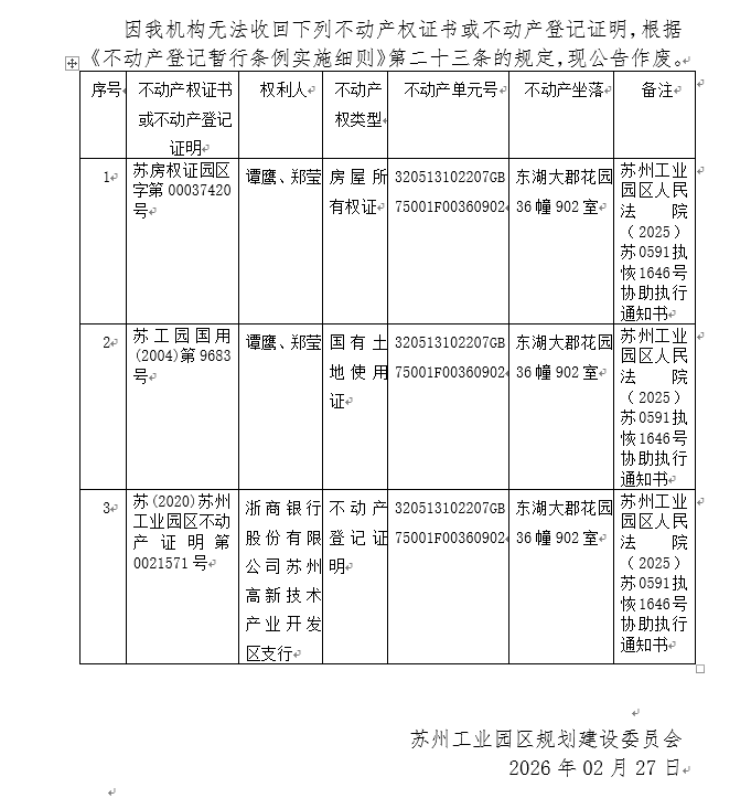 不動(dòng)產(chǎn)權(quán)證書/登記證明作廢公告蘇園 證廢字2026(0051)號(東湖大郡花園36幢902室)