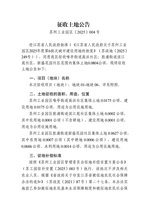 蘇州工業(yè)園區(qū)2025年度第6批次城市建設用地-征收公告