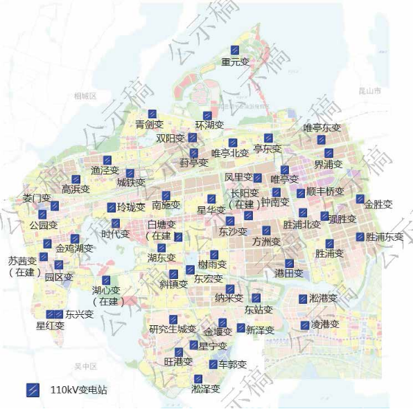遠(yuǎn)期園區(qū)共設(shè)置110千伏變電站52座。保留現(xiàn)狀110千伏變電站14座;擴(kuò)建現(xiàn)狀110千伏變電站16座;在建110千伏變電站4座(蘇茜變、白塘變、湖心變和長陽變);規(guī)劃新建110千伏變電站22座。