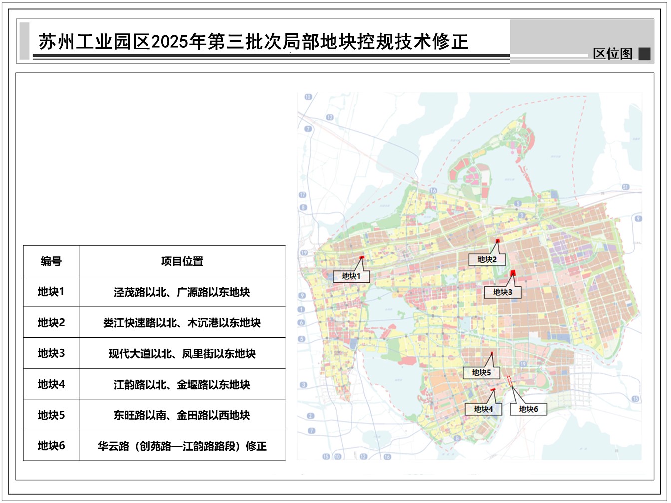 蘇州工業(yè)園區(qū)2025年第三批次局部地塊控規(guī)技術(shù)修正:共包括6個地塊,總用地面積約0.29平方公里,詳見附圖區(qū)位圖。