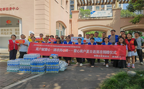 歐典社區黨總支立足社區實際,不斷激活轄區紅色細胞,整合轄區黨建資源,與區域內多家黨組織結成“小典典”黨建共同體,發揮黨建共同體“集聚效應”。今年除了黨建共同體成員外,三星半導體工會以愛心企業的身份加入了送清涼隊伍中來,為我們新業態新就業群體送上驅蚊水、椰子水等眾多清涼物資。在8月9日的捐贈儀式上,歐典社區黨總支、清流社工服務中心代表、新街口商戶代表、新業態新就業群體代表、三星半導體工會、市政環衛、新街口物業、優尼科物業等多方代表,共同見證了這份愛心的傳遞。