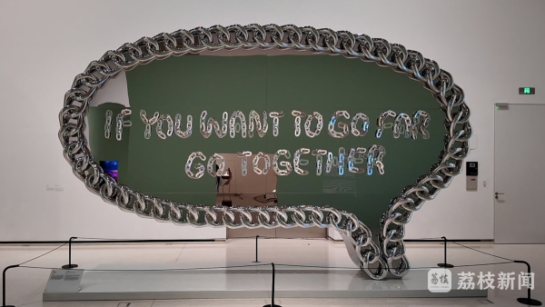 中國(guó)當(dāng)代藝術(shù)領(lǐng)域的標(biāo)志性人物徐震創(chuàng)作的巨型裝置《結(jié)伴才能行遠(yuǎn)》,涂鴉般的文字外圍被一條銀色長(zhǎng)鏈緊緊圈起,充滿激情的宣言被放入線條挺拔的對(duì)話框:“IF YOU WANT TO GO FAR,GO TOGETHER”。這句鏗鏘有力的“結(jié)伴才能行遠(yuǎn)”,擲地有聲地點(diǎn)明了此次展覽的愿景:中新兩國(guó)文化交流面向未來(lái)、攜手并進(jìn)。