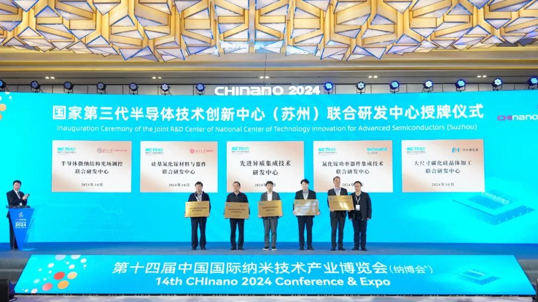 10月23日,第十四屆中國國際納米技術產業博覽會在蘇州工業園區開幕。在開幕式上,國家第三代半導體技術創新中心(蘇州)十大科技問題及研發成果發布,并為國家第三代半導體技術創新中心(蘇州)聯合研發中心授牌。