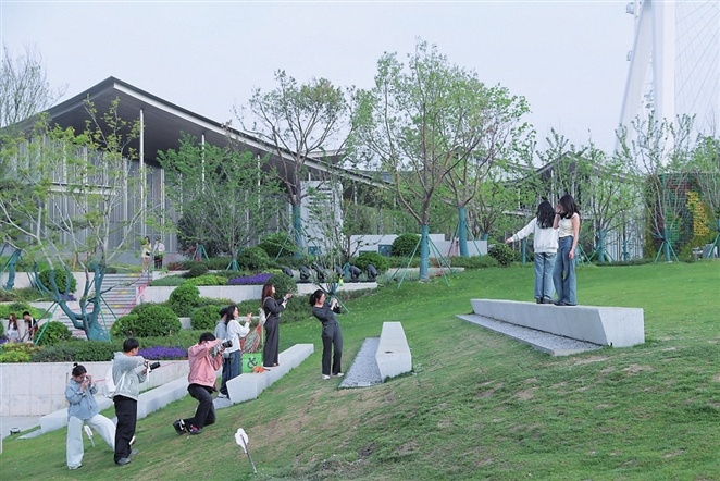 昨日,外地趕來“打卡”的姑娘,按照網上做好的構圖攻略,調整取景框的角度,復刻取景“蘇州之眼”的完美角度。