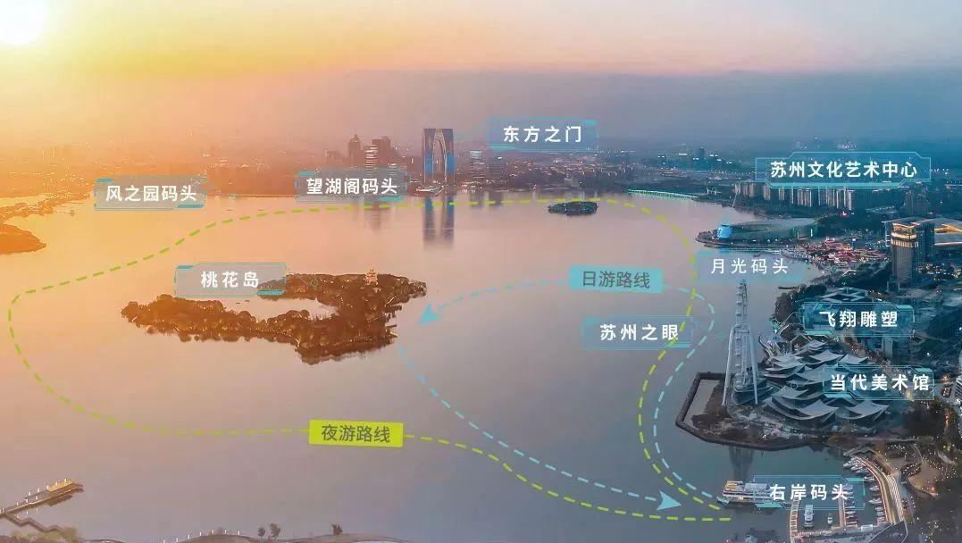 為提升水上旅游服務品質,園區加大運力、拓展航線,右岸新航線串聯起園區金雞湖水上靚麗風景線,助力打造金雞湖右岸場景串聯、客流聯動、人氣共享的文旅消費新場景。新航線包含日游和夜游,其中日游為登島線,沿途觀賞當代美術館、“蘇州之眼”摩天輪、“飛翔”雕塑等城市地標后,登上桃花島游覽;夜游為環湖線,串起蘇州文化藝術中心、東方之門、金雞湖音樂噴泉等標志性景觀,充分滿足游客不同時間段的多元體驗需求。