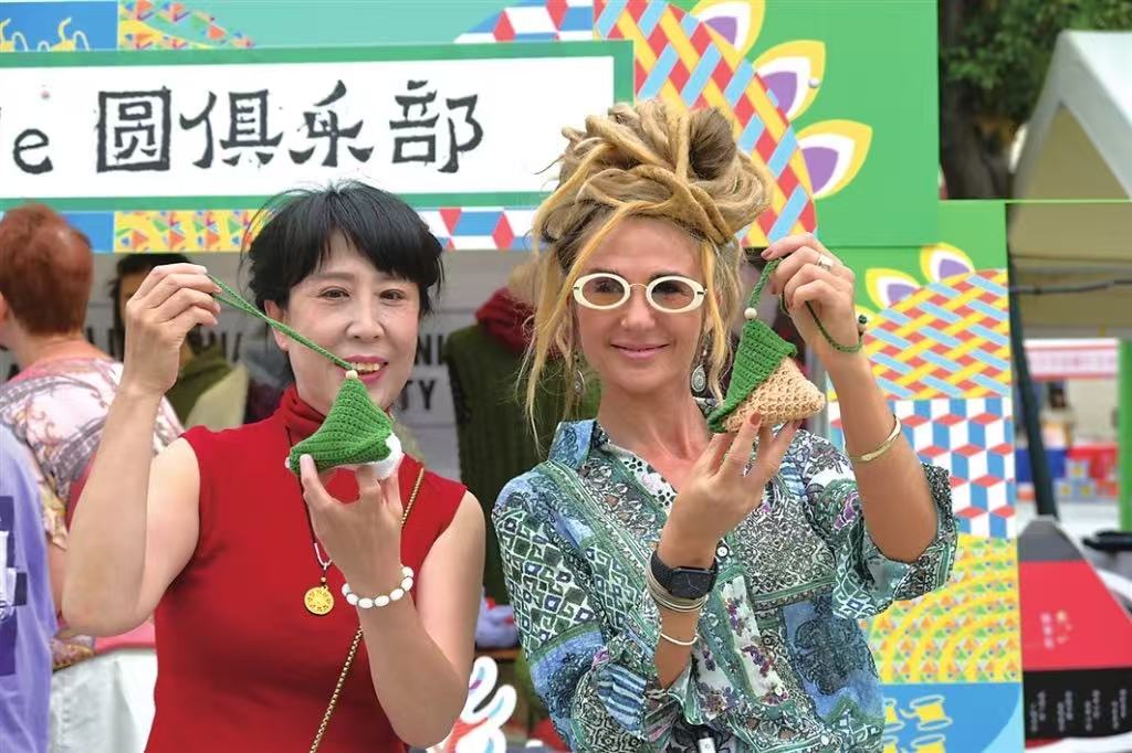 昨日,園區(qū)金雞湖月光碼頭,絨線編織的“絨粽”倍受中外游客青睞。
