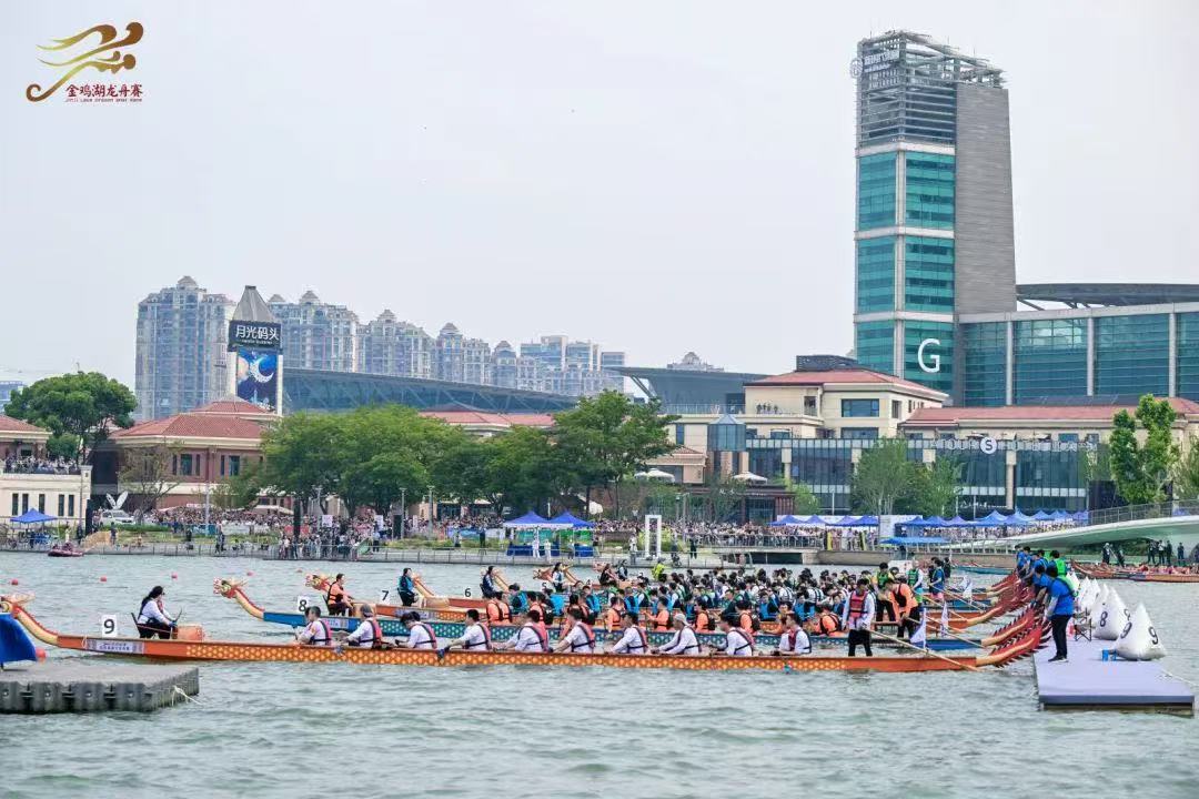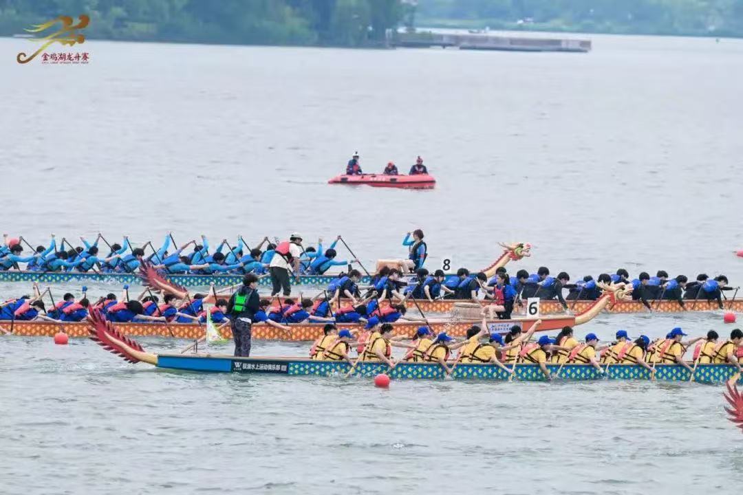 伴隨著激昂的鼓點,一艘艘龍舟如離弦之箭,在金雞湖面上劃出一道道銀色的浪痕。岸邊的觀眾也被熱烈的氛圍點燃,歡呼聲、加油聲一浪高過一浪。