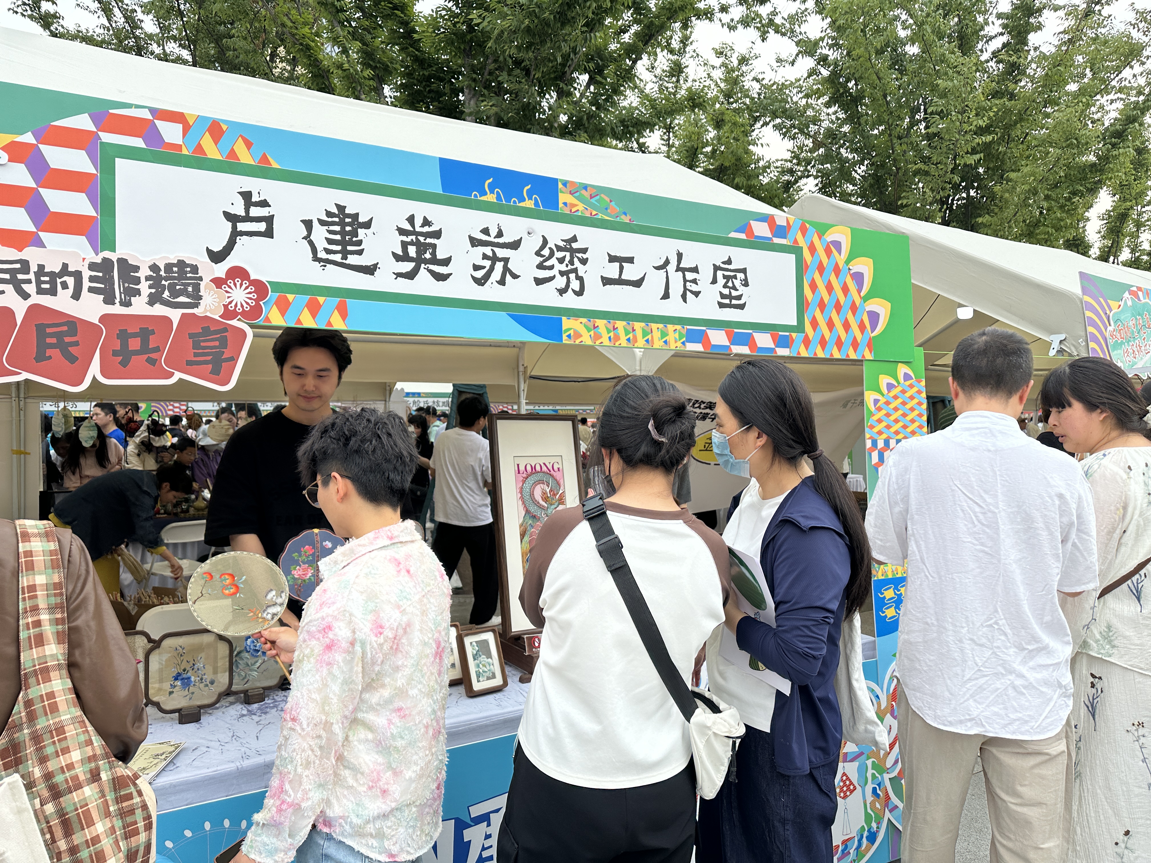 非遺新生代也帶來(lái)了眾多精彩創(chuàng)作。盧建英蘇繡工作室以龍年為主題二次創(chuàng)作的蘇繡作品,色彩明艷,造型新穎。蘇繡第四代傳承人潘乃舒介紹說(shuō):“這幅龍?jiān)刈髌罚糜淆堉圪惖闹黝},今天好多年輕人都被吸引過(guò)來(lái),拿著手機(jī)不停地拍照打卡。”此外,雙面繡團(tuán)扇《事事如意》、栩栩如生的龍舟競(jìng)渡蛋雕作品、散發(fā)著淡淡清香的古法制香療愈系香囊等新生代作品,也讓游客們駐足觀賞,贊嘆不已。