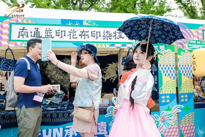 南通藍(lán)染、鎮(zhèn)江竹編、阿林老繡、貴州印染、秋和月手作纏花、山澗民族風(fēng)文創(chuàng)等6項(xiàng)外地非遺及品牌首次參與盛會(huì)。南通藍(lán)染技藝市級(jí)傳承人曹春燕一邊耐心地向大家展示藍(lán)染制品,一邊興奮地說(shuō):“攤位上的藍(lán)染制品都是純手工制作,這次我們是第一次到金雞湖龍船市擺攤,好多小朋友都對(duì)藍(lán)印花布的制作工藝很感興趣,我們都一一介紹,這個(gè)平臺(tái)真是太棒了,給了這項(xiàng)古老技藝一個(gè)絕佳的推廣展示機(jī)會(huì),讓更多人了解藍(lán)染、愛(ài)上藍(lán)染。”