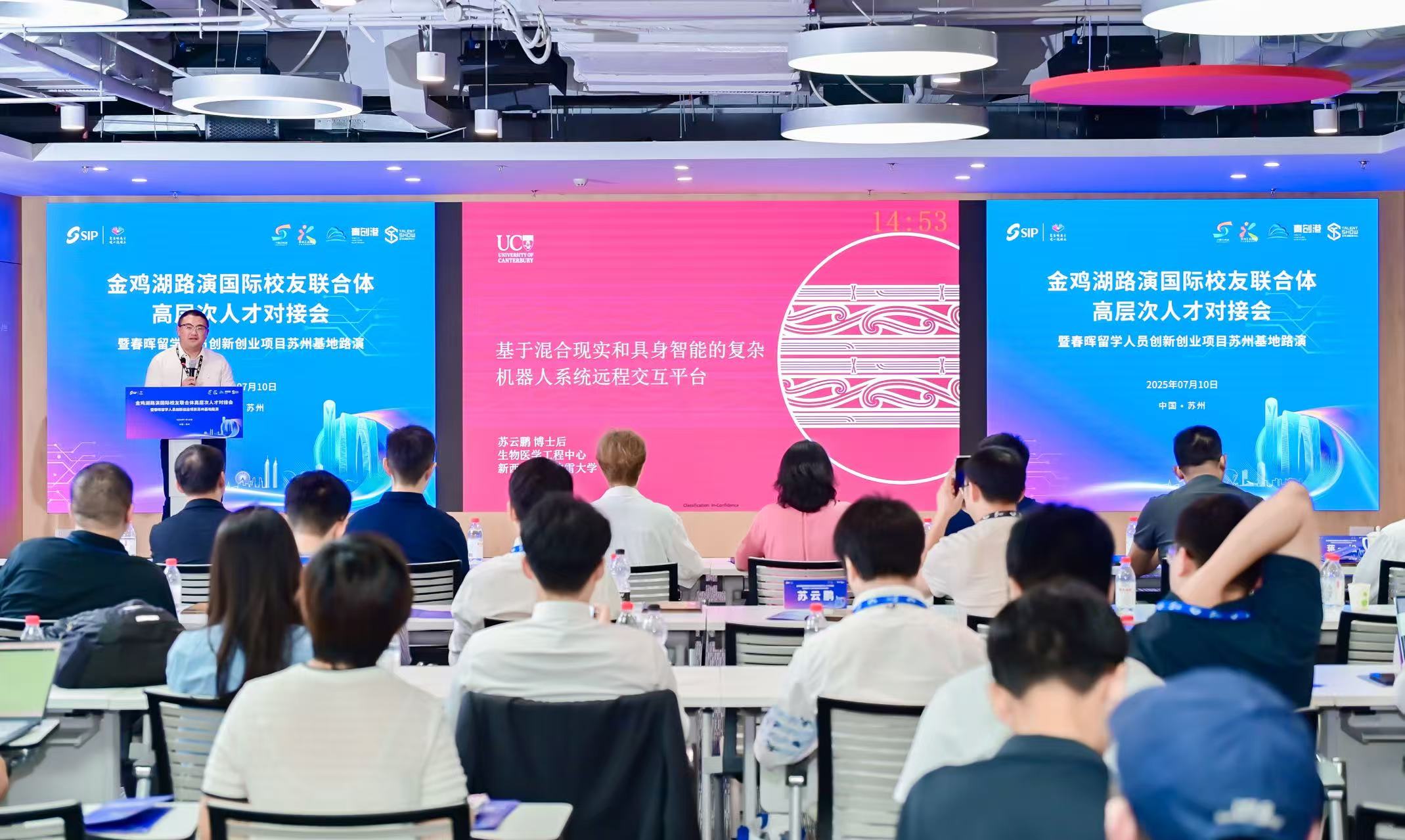 7月10日,2025第十七屆蘇州國際精英創(chuàng)業(yè)周園區(qū)分會場分項活動——金雞湖路演國際校友聯(lián)合體高層次人才對接會暨春暉留學人員創(chuàng)新創(chuàng)業(yè)項目蘇州基地路演在國際人才港舉辦。八大國際校友組織助陣全球引才,來自7個國家(地區(qū))的9個海內外博士創(chuàng)業(yè)項目,聚焦人工智能、生物醫(yī)藥、高端制造等戰(zhàn)略新興領域,上演科技創(chuàng)新盛宴,實現(xiàn)“全球匯智”與園區(qū)產業(yè)發(fā)展需求的精準對接。