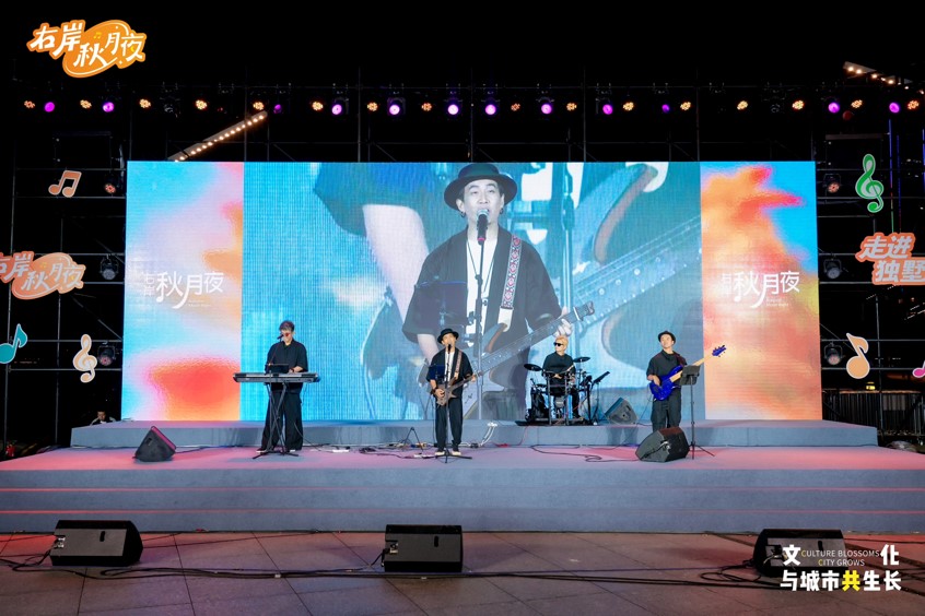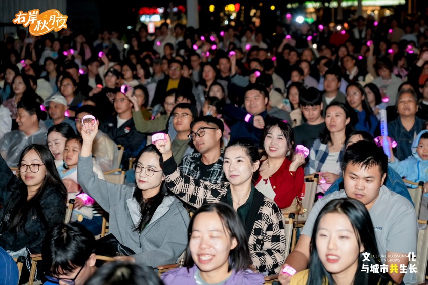 當(dāng)晚的“右岸秋月夜”歌單,滿(mǎn)是秋的詩(shī)意與青春的朝氣,裹挾著蓬勃熱意感染全場(chǎng)。粵語(yǔ)經(jīng)典《紅日》一響,瞬間點(diǎn)燃現(xiàn)場(chǎng)熱情;《戀愛(ài)ing》《小情歌》等曲目則以青澀旋律喚起共鳴。流行樂(lè)隊(duì)、實(shí)力唱將、素人歌手輪番登場(chǎng),帶著對(duì)音樂(lè)的熱愛(ài)為演出注入鮮活能量。一首首經(jīng)典曲目引發(fā)觀眾頻頻揮手合唱,手中的手環(huán)燈光閃爍交織,宛如一片璀璨星海,將獨(dú)墅湖的秋夜點(diǎn)綴得格外浪漫。
