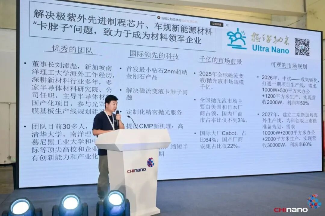 蘇州極鉆納米科技有限責任公司CEO劉添彪,介紹了《超納金剛石三代半加半導體精拋材料和算法產業化》。超納金剛石具有量子特性的超小尺寸效應,比普通金剛石更硬,導熱性、光、聲、電、磁、負載、生物相容性,可應用在精密拋光、磁流變、納米機器人、核電池等領域。該項目聚焦于超納金剛石材料的宏量生產,粒徑晶型表面調控,相比較傳統的爆轟法破碎法,其超納金剛石尺寸更小一個數量級,更凸顯量子特性。作為超納材料高新技術的先鋒,該公司以半導體產品與車規新能源材料雙輪驅動,構建起以研發為主導、生產、銷售、進出口為一體的產學研結合新星企業,專注于硬科技、卡脖子、國產替代的戰略布局。