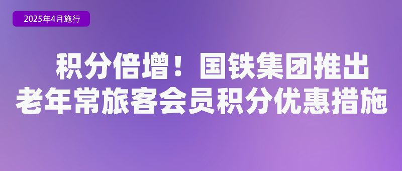 4月1日起,國鐵集團在現行“鐵路暢行”常旅客會員服務基礎上,對年滿60周歲持居民身份證、港澳居民居住證、臺灣居民居住證、港澳居民來往內地通行證、臺灣居民來往大陸通行證、外國人永久居留身份證的老年常旅客會員實施更大幅度的積分優惠,積分可兌換火車票,將更好地滿足老年旅客對美好旅行生活的向往,為促進銀發經濟發展、擴大服務消費注入新動能。