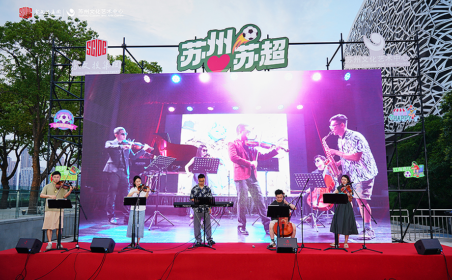 目光轉向現代傳媒廣場、蘇州文化藝術中心湖濱廣場,迷觀賽的“熱力值”同樣拉滿。作為夏夜市集頂流IP,傳媒之夜開啟“蘇超”模式,夜市云集40余家潮流“好市”,包括品牌餐飲、江南甄選、袞展文創等,滿足迷看賽一切期待;足魔方——籠式足則讓市民體驗競技運動樂趣,在360°全圍擋的燈光籠中,快節奏攻防轉換不斷進行,街頭足的即興創造力盡顯。而在蘇州文化藝術中心湖濱廣場,賽的激情與多元文化的魅力交織,這里有豐富多樣的美食,熱愛生活、會玩有趣的生活藝術家,現場的演出更讓這個夏夜顯得與眾不同。