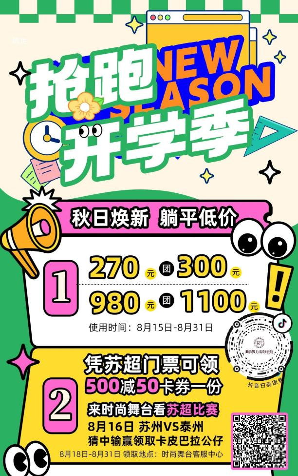 運動品牌方面,時尚舞臺奧特萊斯推出“運動煥新正當時”搶跑開學季主題促銷,耐克、NewBalance等品牌秋季新品折扣力度空前,同步開展抖音團購、競猜贏公仔、錄取祝福、銀行立減等多重優惠,輕松購齊開學裝備。