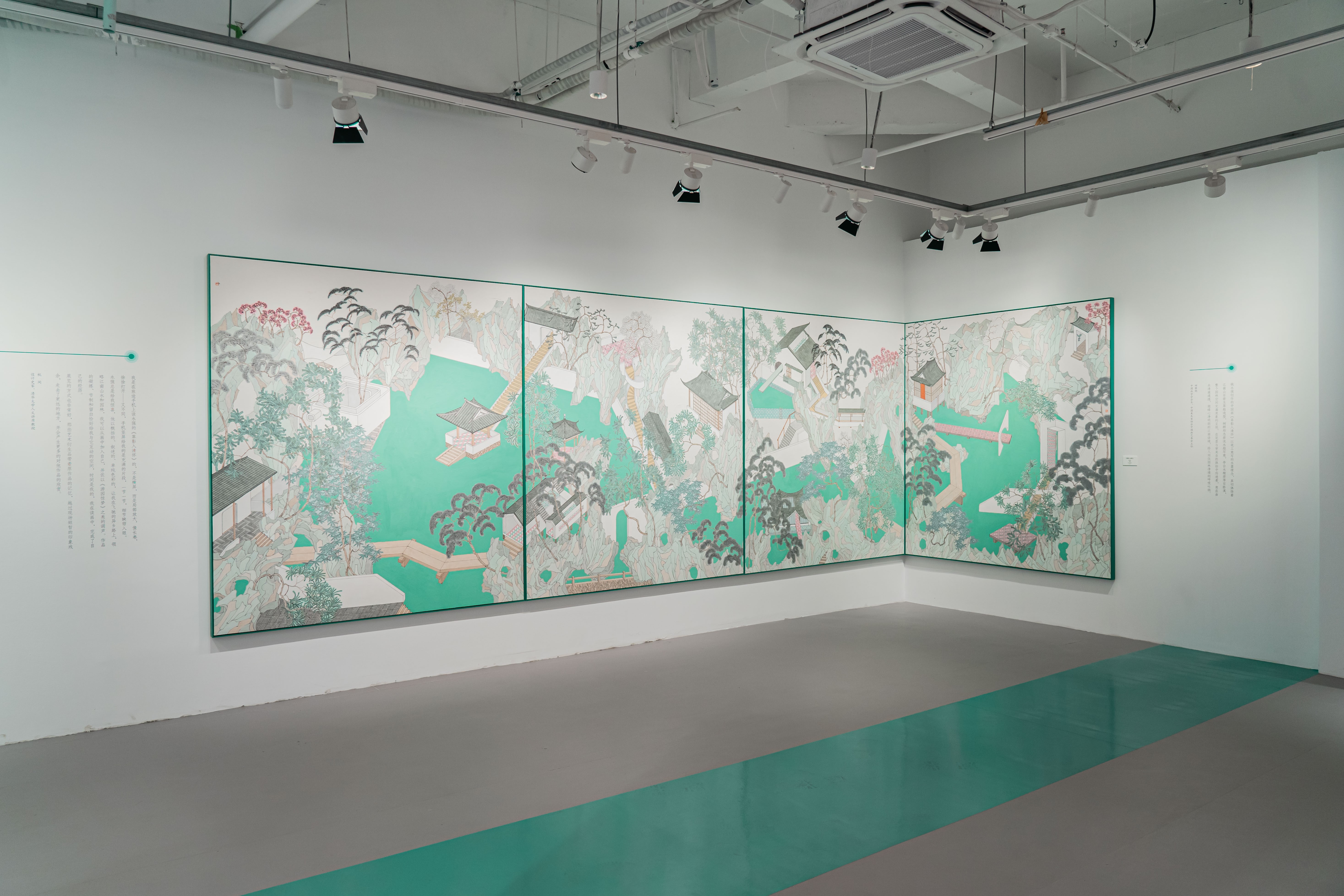 走進展廳,滿目青翠的寫意畫卷撲面而來,正是姚永強創作生涯中尺寸最大的園林作品——《翠影入清懷》。作品既延續了他標志性的青綠色主調與平面式構圖,又注入了對園林的當代思考。