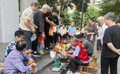 與此同時(shí),同星園廣場(chǎng)上熱鬧非凡,一場(chǎng)結(jié)合便民服務(wù)與趣味游園的創(chuàng)意活動(dòng)在此開展。便民服務(wù)區(qū)內(nèi)匯聚了健康咨詢、理發(fā)修甲、磨刀、智能AI宣傳、套圈等多元化項(xiàng)目,網(wǎng)格員和志愿者引導(dǎo)居民有序參與,并耐心為老人測(cè)量血壓,提供個(gè)性化健康指導(dǎo)。游園活動(dòng)區(qū)內(nèi)人頭攢動(dòng),投壺競(jìng)技、果蔬套圈、“好運(yùn)滾滾來(lái)”等游戲項(xiàng)目前吸引了不少老年居民圍觀參與。“紅管”志愿者用通俗易懂的語(yǔ)言講解游戲規(guī)則,協(xié)助老人游玩,現(xiàn)場(chǎng)笑聲不斷,讓老年居民在輕松愉悅的氛圍中感受社區(qū)的貼心關(guān)懷。