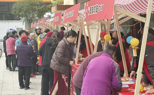 與室內戲曲的靜雅相呼應,戶外廣場上的元旦主題文化市集則是一片熱鬧歡騰的景象。市集緊扣“團圓、祈福、迎新”主題,設置了多個兼具文化韻味與互動趣味的攤位。“元旦福運剪紙坊”和“團圓燈籠DIY攤”前,居民們親手剪出福字窗花、制作紅火燈籠,將新年祝福融入手工作品;“吉祥香囊手作”攤飄散著淡淡藥草香,寄托著人們對健康平安的祈愿;“傳統冰糖葫蘆鋪”與“暖心湯圓驛站”更是人氣十足,酸甜的冰糖葫蘆勾起童年記憶,一碗碗熱騰騰的免費湯圓,溫暖了居民特別是老年人與外賣員、保潔員等新業態從業者的胃,更溫暖了他們的心。“元旦猜謎互動攤”則傳來陣陣歡聲笑語,居民在趣味競猜中增長了傳統文化知識。各攤位內外聯動,共同構成了一個充滿煙火氣與人情味的節慶空間。