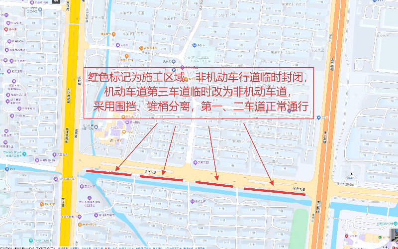 因道路交通導改情況復雜,該段需分段施工,將南北兩側分段,預計施工工期5天。為保證現場安全,施工期間,施工路段的非機動車行道臨時封閉,機動車道第三車道臨時改為非機動車道,采用圍擋、錐桶分離,非施工人員禁止入內,第一、二車道正常通行,請過往市民按照現場施工標志提示有序通行,服從現場疏導人員指揮,小心慢行。如有條件,可盡量提前擇道繞行,給出行帶來不便,敬請廣大市民諒解。