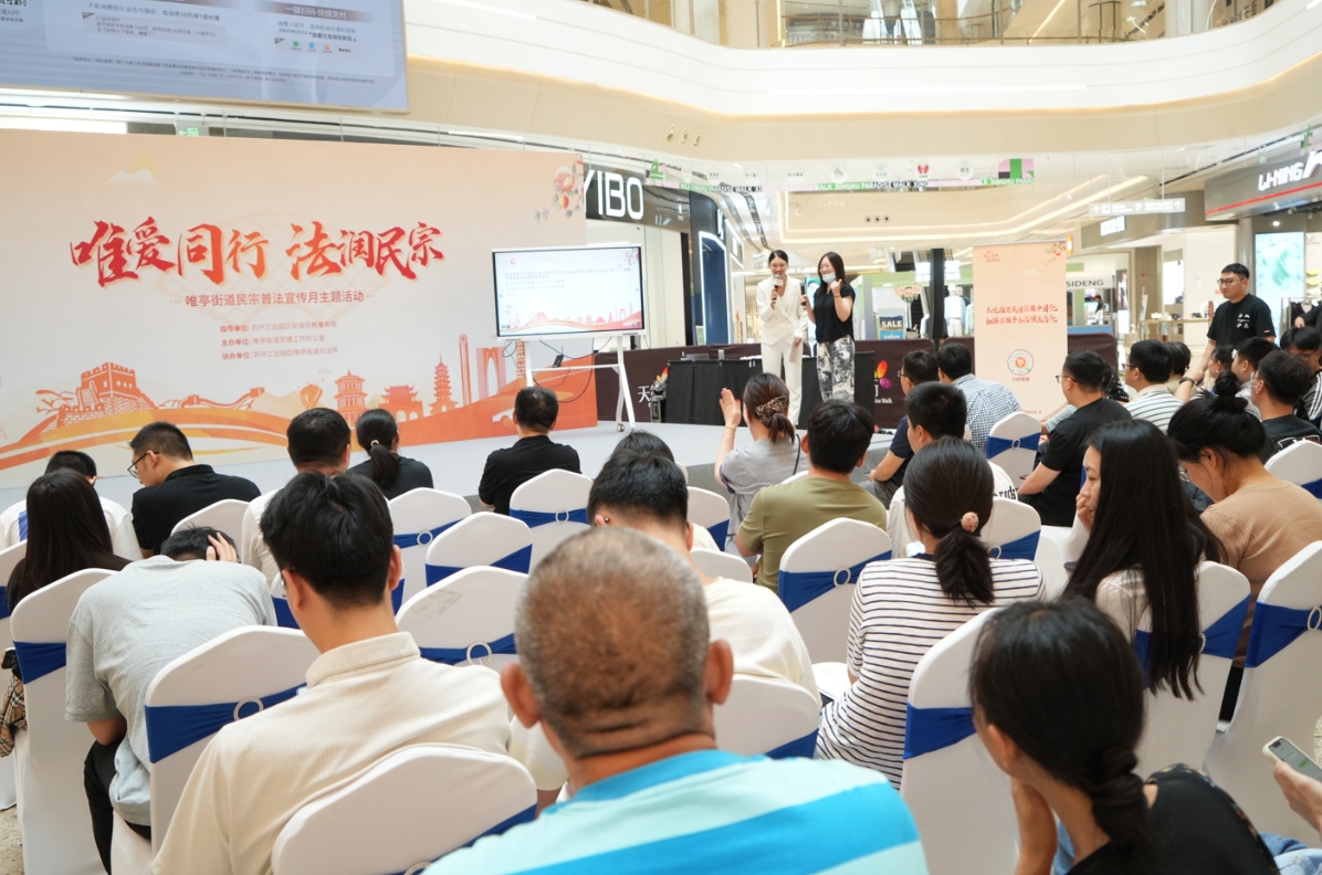 為切實提升民族宗教政策和法律法規覆蓋面與知曉度,增強園區居民民族宗教政策法規學習熱情,6月19日下午,由園區民宗局指導、唯亭街道辦事處承辦的“唯愛同行 法潤民宗”民宗政策法規主題宣傳活動在蘇州星湖龍湖天街圓滿舉辦。唯亭街道辦事處有關領導、唯亭街道各社區民宗干部及社會各族各界群眾代表等100余人參加本次活動。