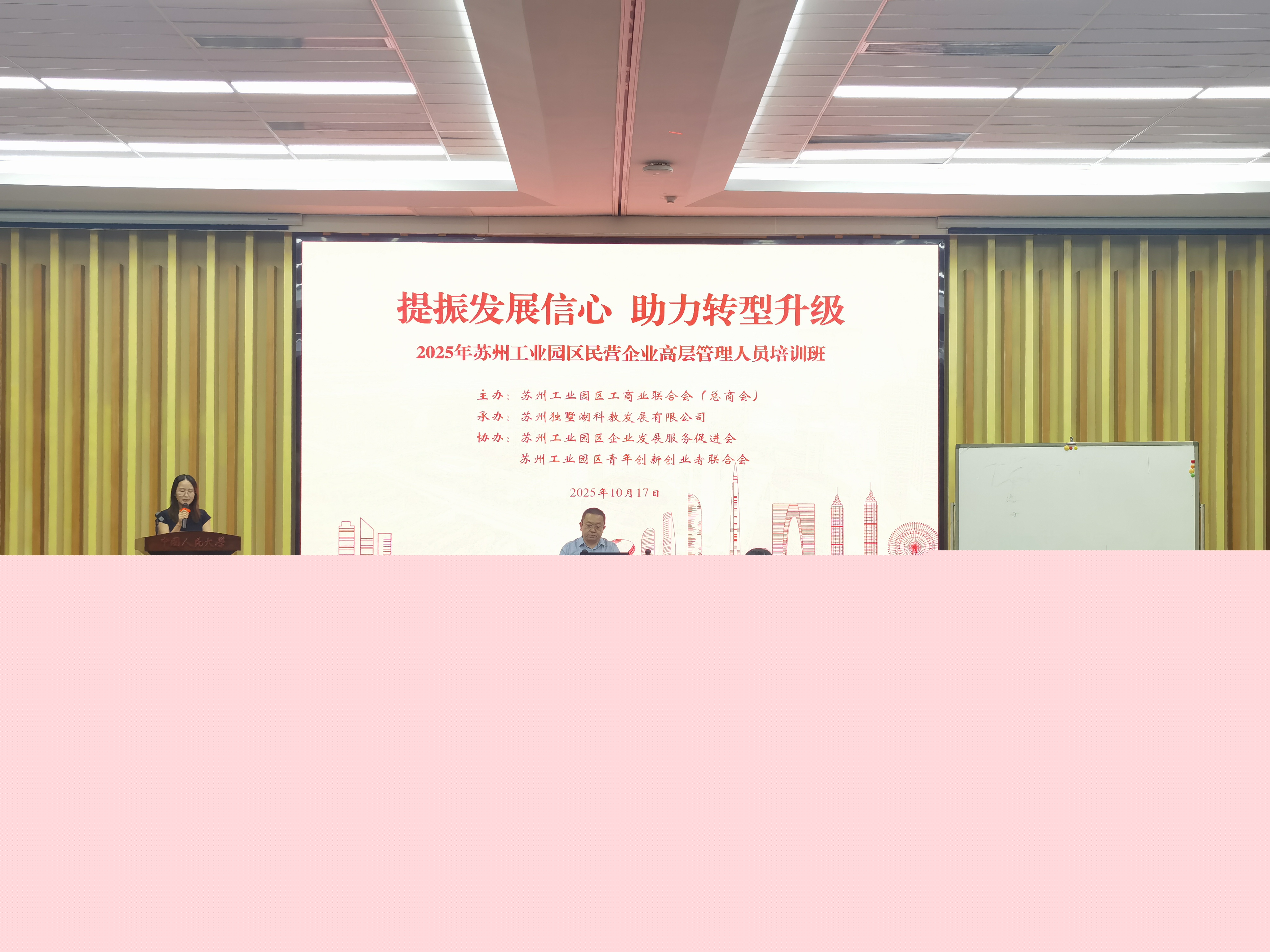 10月16日至17日,2025年蘇州工業(yè)園區(qū)民營企業(yè)高層管理人員培訓(xùn)班在中國人民大學(xué)(蘇州校區(qū))成功舉辦。本次培訓(xùn)由園區(qū)工商聯(lián)(總商會)主辦,旨在幫助園區(qū)廣大民企負(fù)責(zé)人開拓視野、認(rèn)清形勢,準(zhǔn)確把握新時(shí)代中國穩(wěn)中求進(jìn)的大趨勢,不斷提高民企的內(nèi)生動力。兩天共超過200人次參加培訓(xùn)。