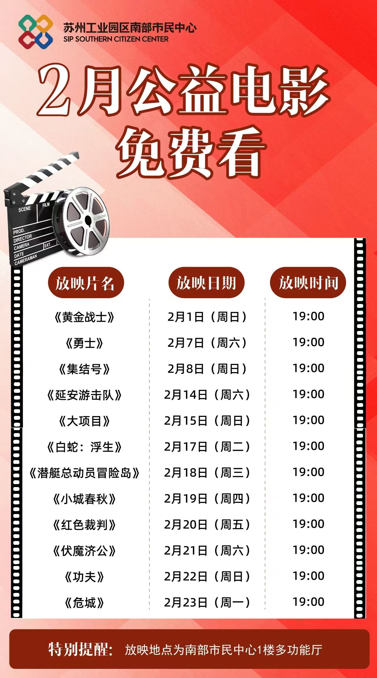 春節(jié)期間,文化惠民不打烊。園區(qū)南部、北部市民中心將推出公益電影展映,二十余場經(jīng)典影片免費(fèi)播放,包括《白蛇:浮生》《小城春秋》《功夫》等等,讓市民在團(tuán)圓之余,享受一份輕松愉悅的光影之樂。