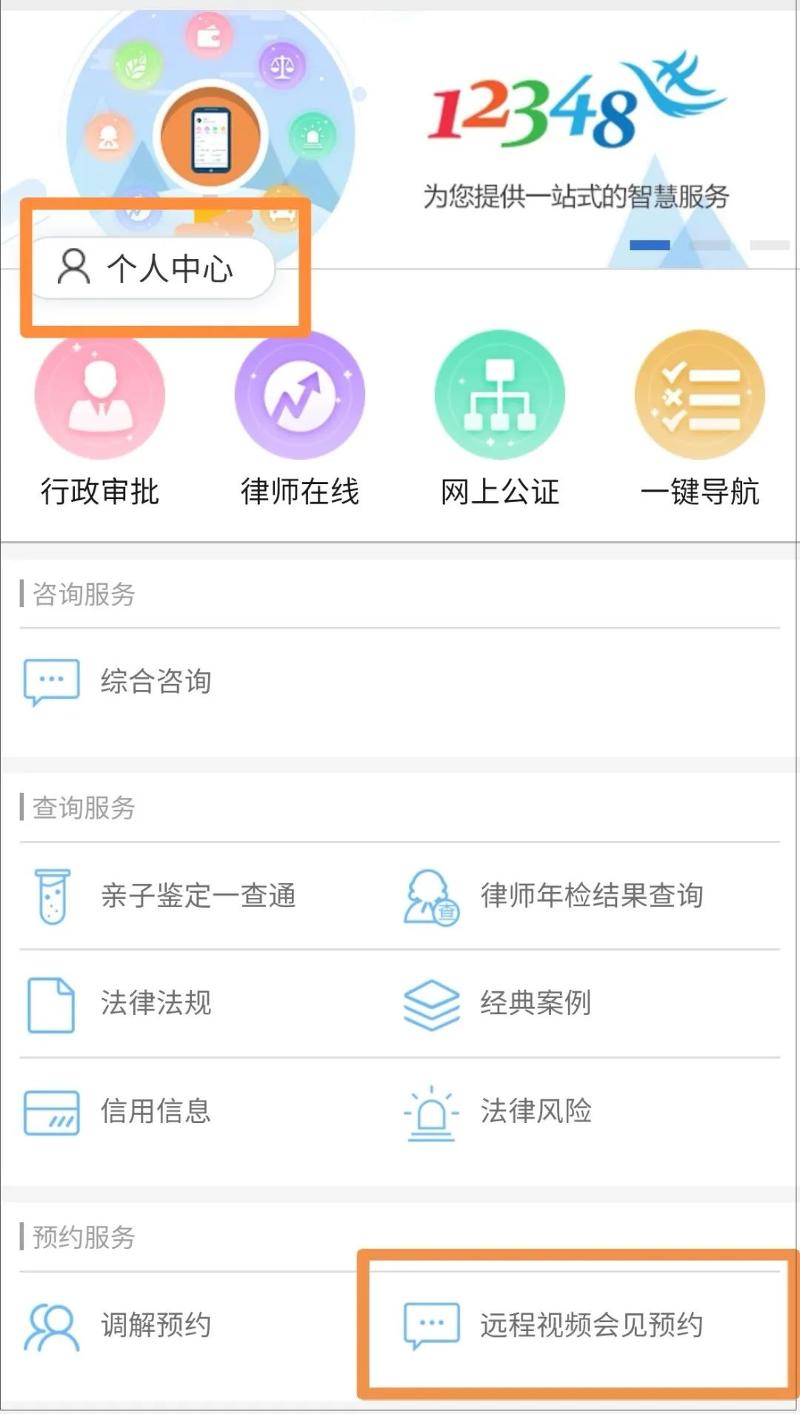 第二步:進入公眾號后,點擊頁面底端“法律服務”,新用戶需要先點擊左上角的“個人中心”進行注冊。注冊后,在法律服務頁面“預約服務”板塊點擊“遠程視頻會見預約”。