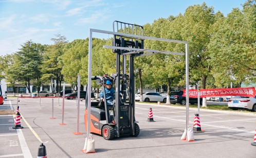 競賽設置預賽與決賽兩個階段,全方位檢驗選手綜合素養(yǎng)。預賽環(huán)節(jié)采用“理論+實操”的考核模式:理論測試涵蓋叉車安全操作規(guī)程、設備日常維護、應急處置流程及相關法律法規(guī)知識,重點考察選手安全理論功底與合規(guī)意識;實操項目為電動平衡重叉車帶托盤競速繞樁,選手需在5分鐘內完成“叉取托盤—轉運堆疊—指定存放—倒庫停車”全流程,考驗精準操控與高效作業(yè)能力。經綜合評定,40名選手憑借過硬實力脫穎而出,晉級決賽。