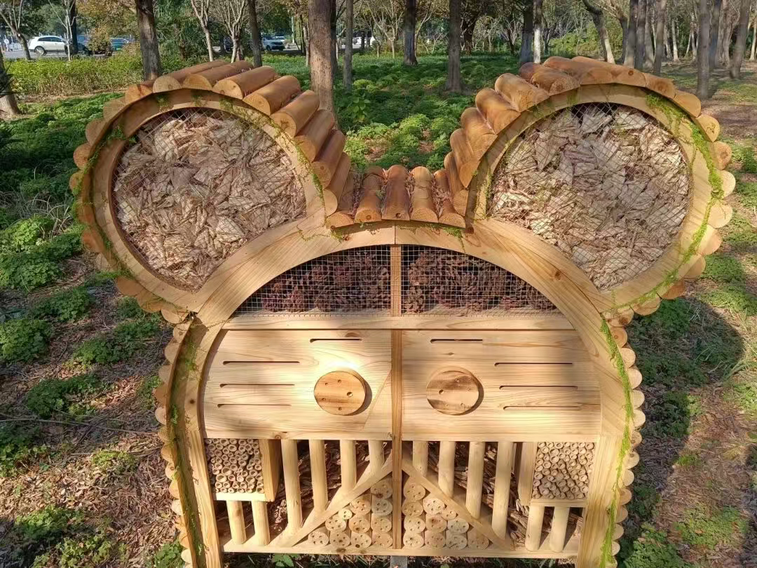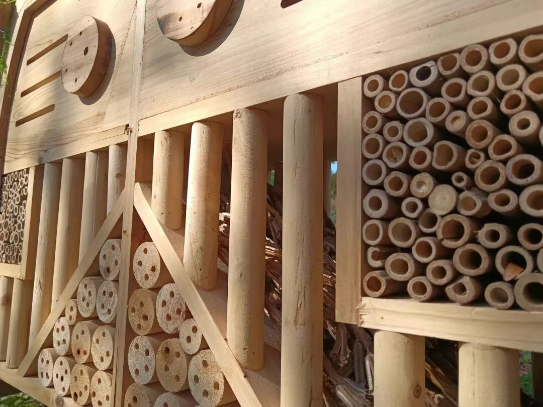“昆蟲客棧”作為一項生態實踐,旨在通過人工方式為城市昆蟲提供棲息場所,進而優化完善自然生態。在園區本地化實踐中,市政服務集團堅持資源循環利用理念,選用鉆孔樹干、竹筒、松塔等天然材料,結合氣候特點進行模塊化設計,為不同昆蟲提供適宜的“安居”空間。