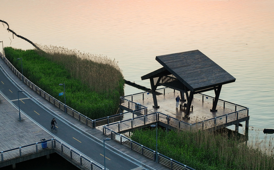 在環湖自行車道上,也別忘了留意湖畔那些散落的親水木亭,它們靜靜地探向湖面,是絕佳的歇腳點。