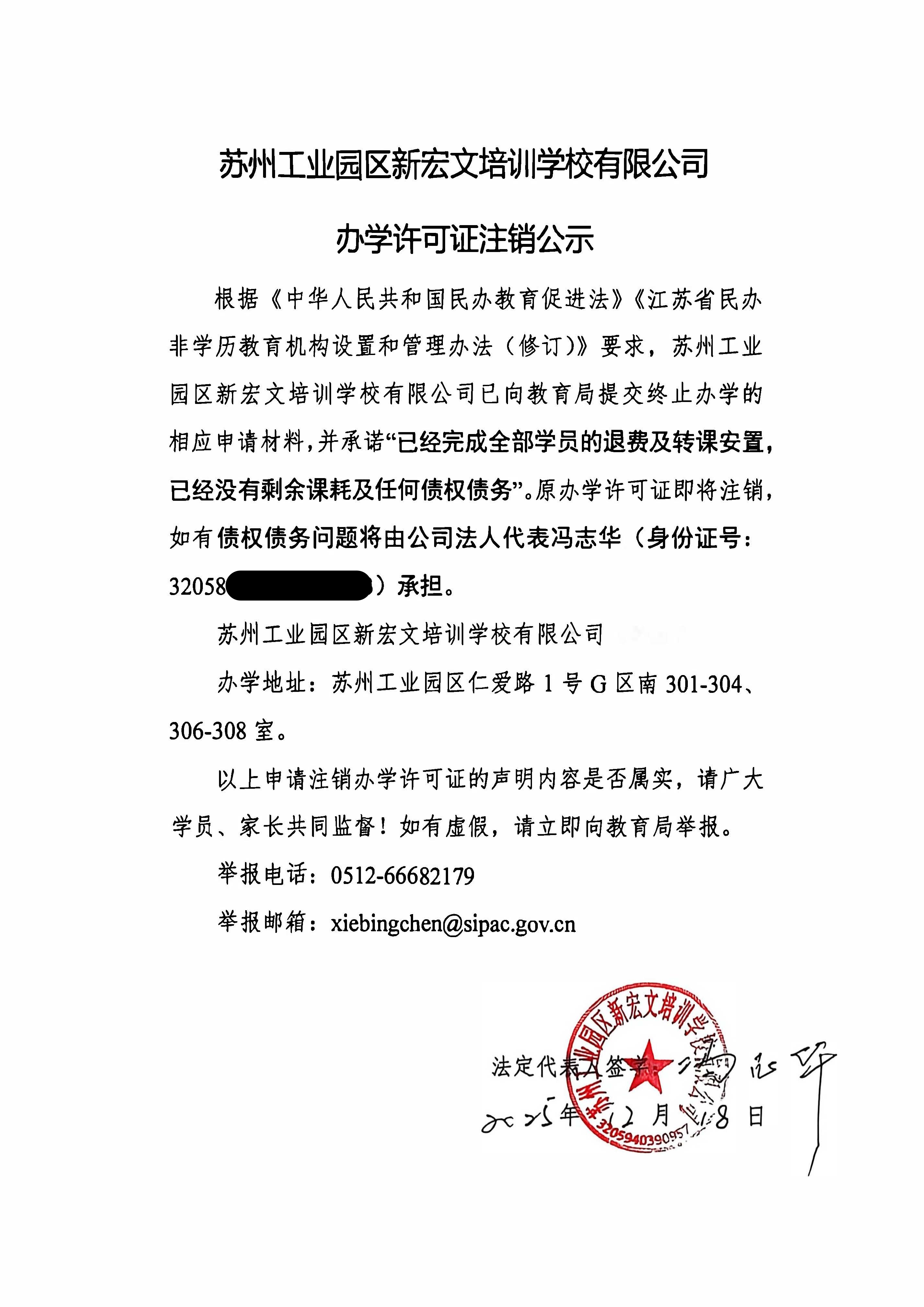 蘇州工業(yè)園區(qū)新宏文培訓(xùn)學(xué)校有限公司辦學(xué)許可證注銷(xiāo)公示